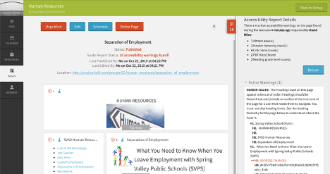 GUIDE provided instant visibility into the existing content accessibility problems on the site. The GUIDE reports quantify accessibility errors—such as missing alt text, inaccessible PDFs, header structure problems, and contrast issues—across the whole site. Then, it shows webmasters exactly where each problem is located and provides a plain-English explanation of how to fix the issue in the eChalk CMS.
